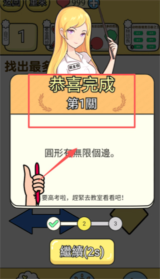 3、成功通过关卡后,可等待底部“继续”按钮的2秒倒计时结束,随后自动进入后续关卡;也能直接点击该“继续”按钮,即刻进入后续关卡。