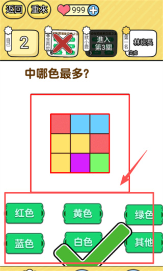 4、当碰到颜色统计类题目时,可从下方的选项栏里勾选绿色确认项,也可以精准判断九宫格中分布数量最为多的色彩类别。
