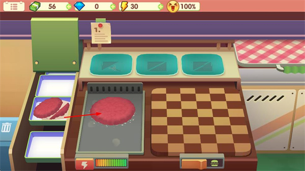 1、玩家要制作汉堡,第一步是在煎锅上煎肉饼,务必让肉饼煎至合适状态。