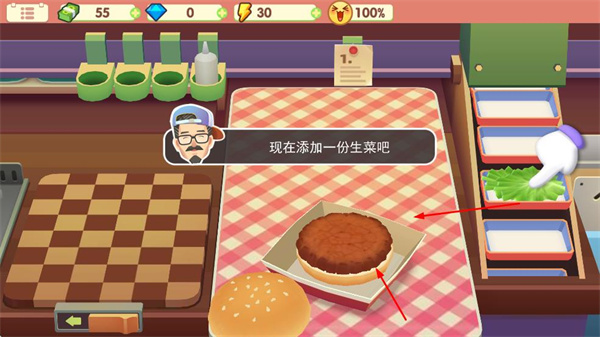 2、肉饼煎好后,按照提示加入生菜等食材,一步步组合成一个完整的汉堡。