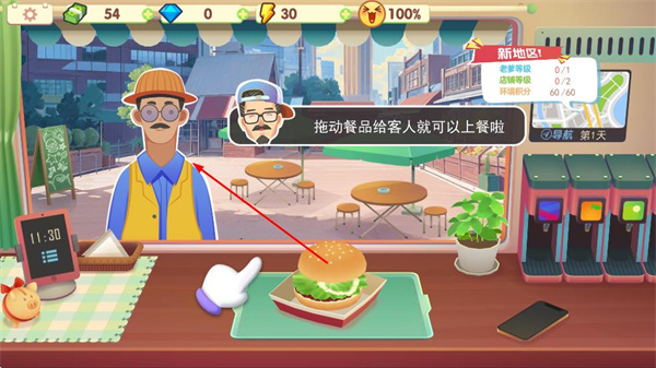 3、汉堡制作完成后,把汉堡拖给客人,以此完成上菜动作。