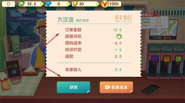 4、当客人食用完汉堡后,系统会生成订单结算单。玩家能够依据该结算单所呈现的情况,对经营策略做出调整,以此提高汉堡店的收益。