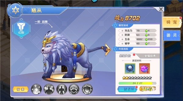 3、通过消耗资源来提升坐骑等级,是获取战力极为重要的途径。