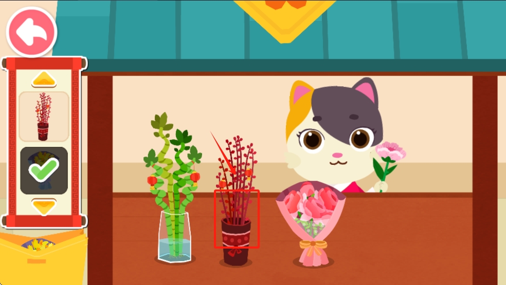 3、完成节日相关的装饰,如摆放花卉,点击并拖动花卉到指定的花瓶中。
