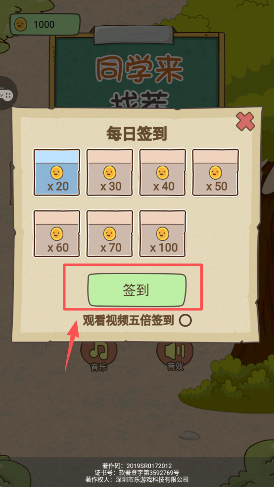 1、点击“签到”按钮进行每日签到。观看视频可获得五倍奖励,增加你的游戏货币。