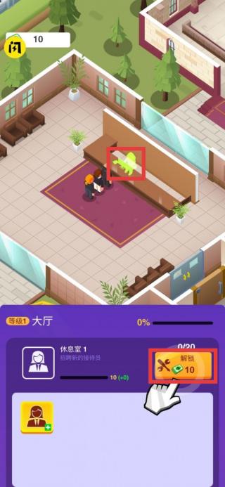 1、打开界面,建造大厅时需要花费10元解锁新的招待员。