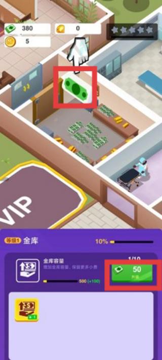 2、点击金库上方的按钮,再点击【升级】可以让客人给予更多的小费。