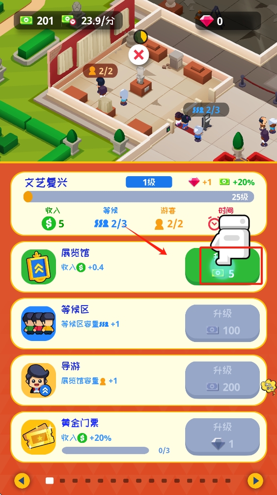2、点击建筑进入升级界面,找到“展览馆”选项并点击绿色升级按钮,提升展示空间与游客容量。