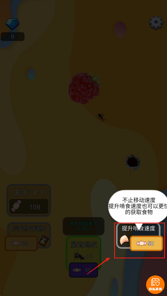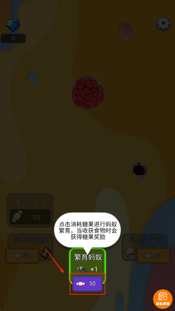 1、点击消耗糖果进行蚂蚁繁育,当收获食物时会获得糖果奖励。