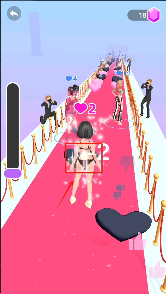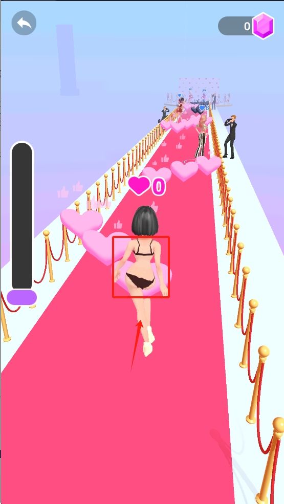 2、通过点击屏幕让角色跳跃,避开红毯上的障碍物。注意观察,以收集更多爱心。