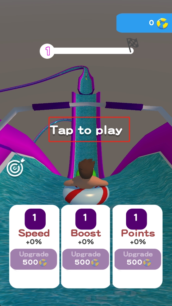 当你看到屏幕上提示“点击开始”的文字区域时,点击它就能进入游戏。建议先关注界面下方的升级功能,通过消耗指定物品来增强角色属性,这样能更好地为即将到来的水滑梯速度比拼做好准备。