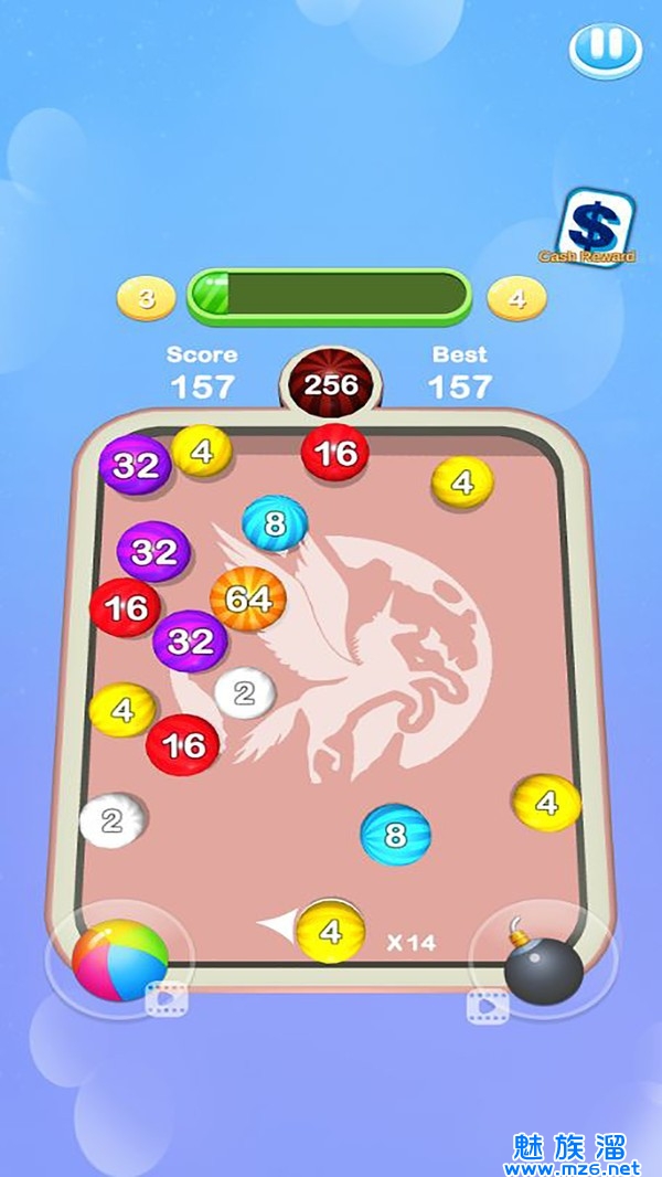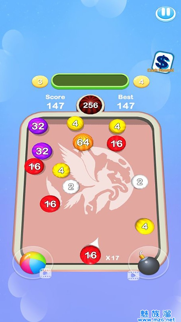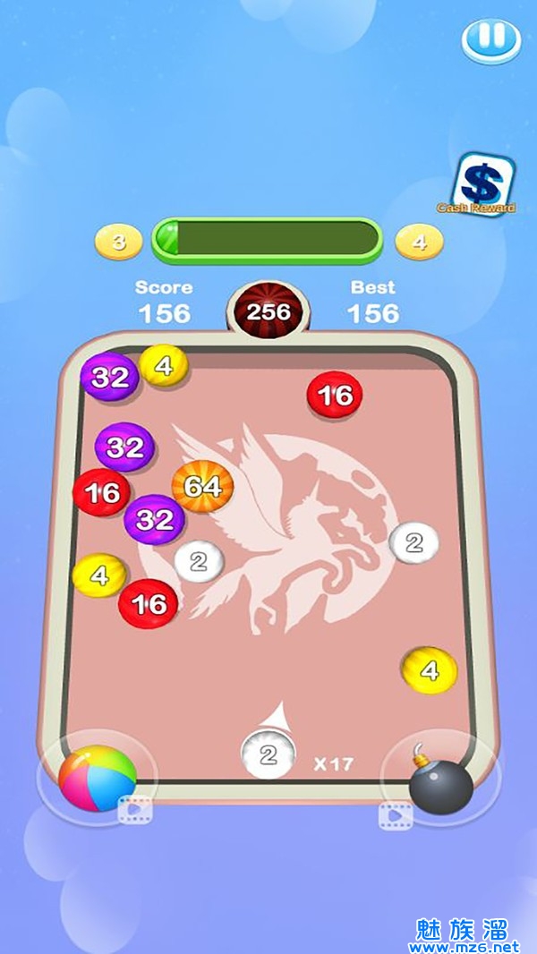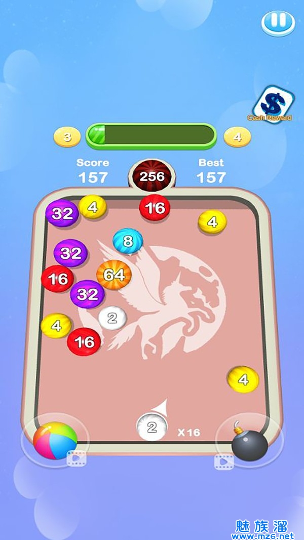 1、将球在桌上射击合成,将数字合并为2048,使数字刚好符合要求的数字;