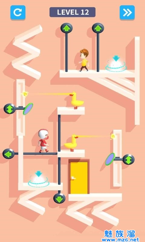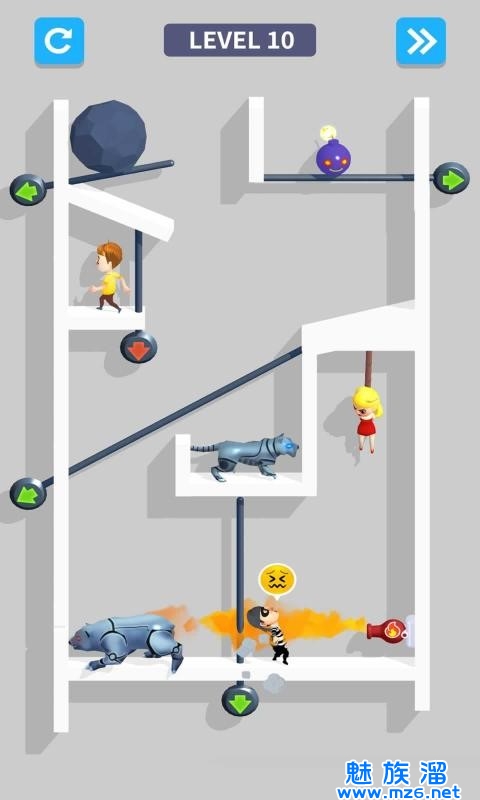 3、游戏中玩家需求在窘境中拉动大头针以找到一条通往胜利的道路,同时要留意那些动物机器人;