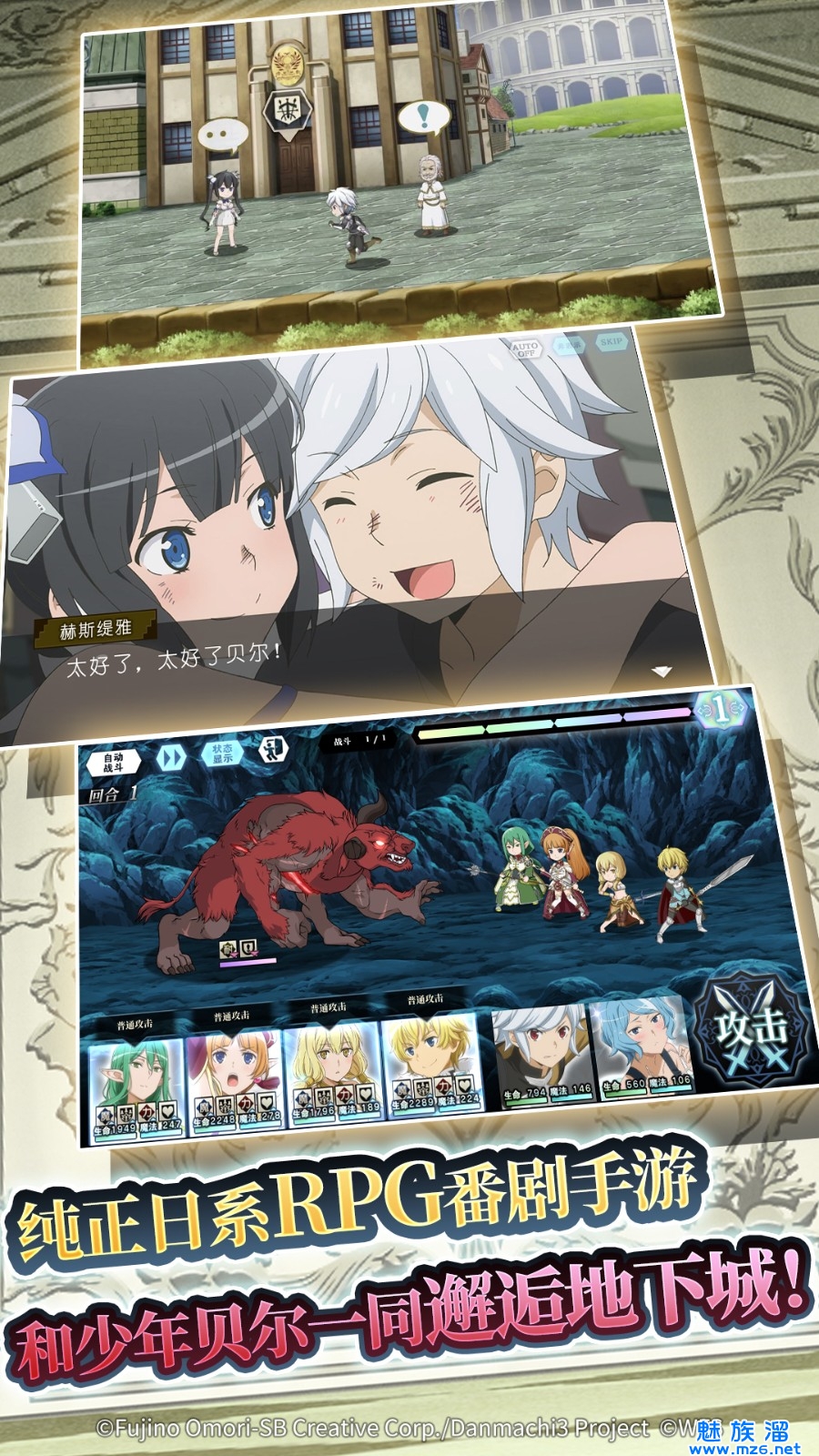 游戏本身继承了日式经典RPG的回合制玩法,包括迷宫探索、剧情任务、卡牌收集及角色养成。超百张精美人物立绘及礼装,自由组合随心搭配,组建属于自己的“眷族”小队!