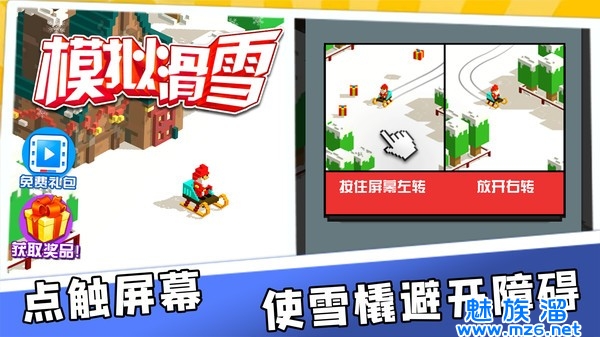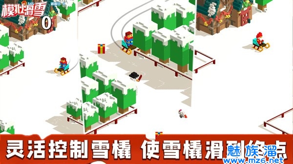 1、操作玩法十分简单好上手,点击屏幕移动自己的角色的雪橇来避开那些赛道上的障碍。