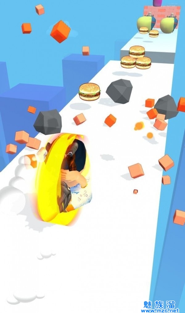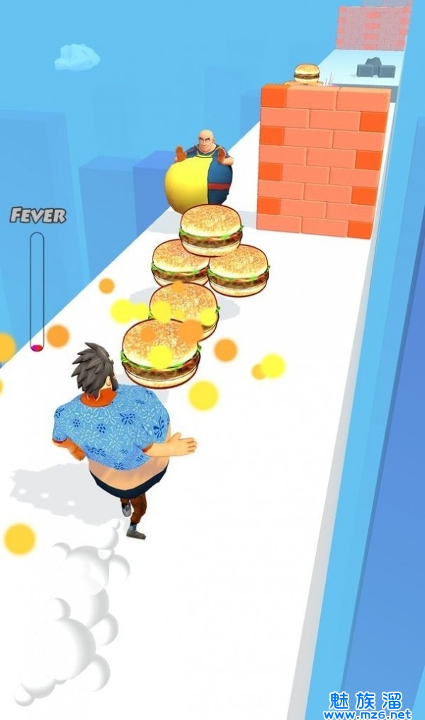 2、但是如果我们的肚子不够大是很难击倒他们的,通过收集赛道上的各种食物,可以让游戏内角色的肚子变得越来越大。