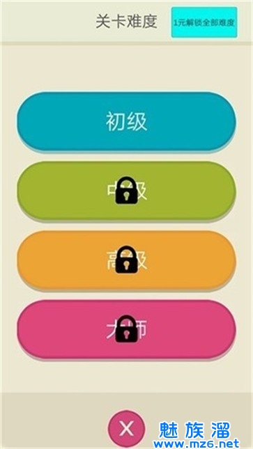 游戏分为四个难度,初级、中极、高级,大师四个难度需要玩家一个一个来解锁。