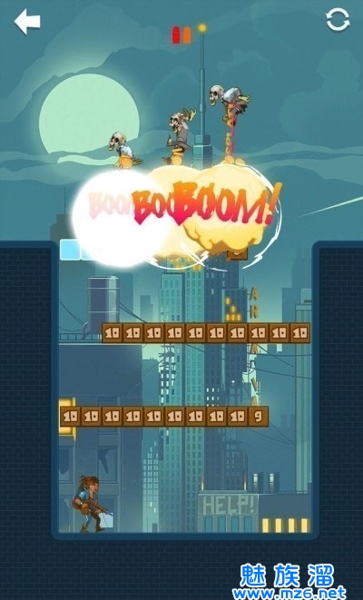1.游戏中玩家需要考虑如何射击子弹才能击杀僵尸,难度也会随着关卡的增加而增加。
