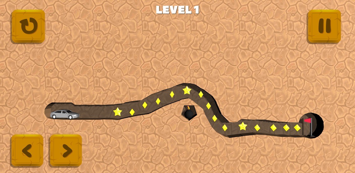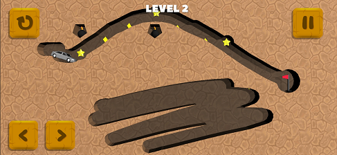1、在游戏提供的场景内,我们要通过手指涂抹的方式来为车辆挖掘出一条可行的道路,最好是吃掉界面上的星星以及菱形奖励;