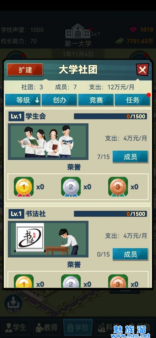 社团:学校社团玩家可以组建各种社团,每个社团都是不同的,满足学生不同兴趣爱好