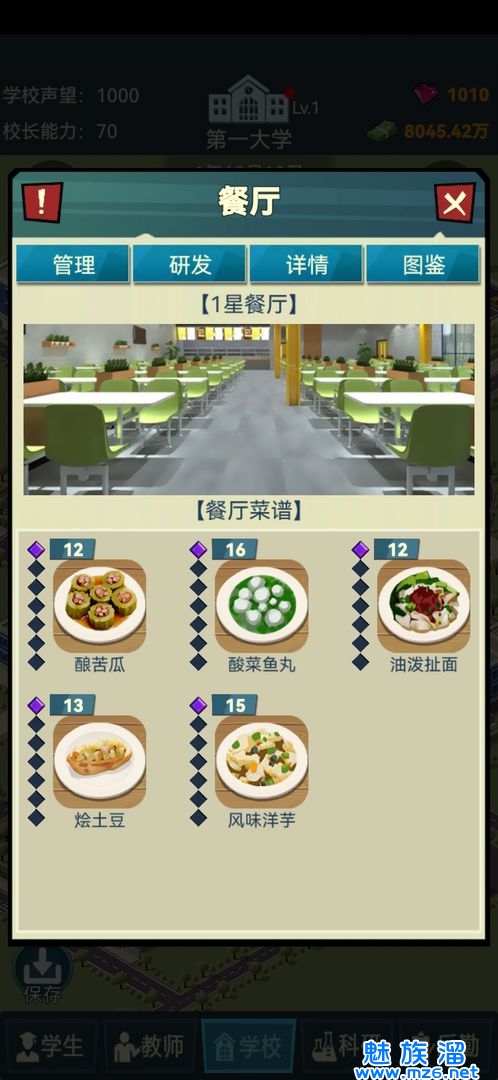 玩家可以招聘不同等级不同稀有度不同能力的厨师,调整和调价各种菜品满足学生不同口味