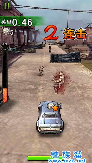 游戏中撞击僵尸会得到积分,当积分到一定程度时候,会给玩家一次随机获得道具的机会,具体表现在游戏画面左边的进度条,另外撞击僵尸还能获得银币,银币可以 在游戏结束后在游戏商城中购买新车和道具,不过部分道具需要金币,貌似需要通过网页在线购买,算是收费项目。