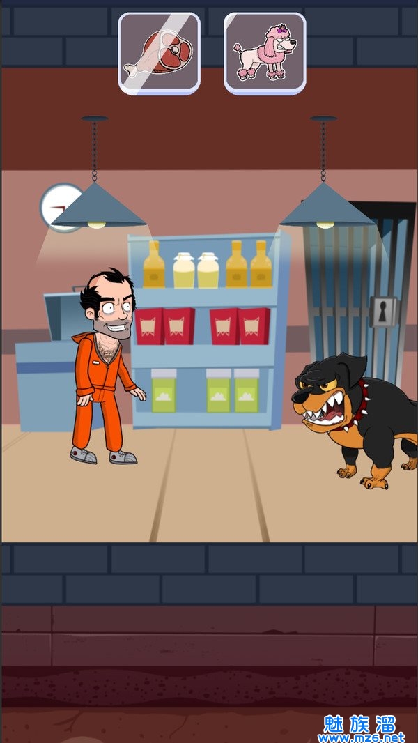 《越狱小哥》是一款非常好玩的解谜类逃生游戏,罪犯想要越狱,虽然巡逻的警察已经走开了,但越狱的路上还会遇到各种麻烦,面对恶霸犬该怎么办,如果没有想出很好的办法,玩家随时都会越狱失败,你可以在两个选项中选择逃生的方法,一旦选择失败,小哥有可能就会给抓回监狱重新开始。来锻炼下你的脑力吧!