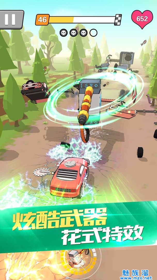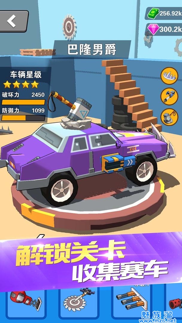 你可以给赛车撞上电锯等具有攻击性的武器,直接向着对手的车辆冲上去才是胜利的方法。