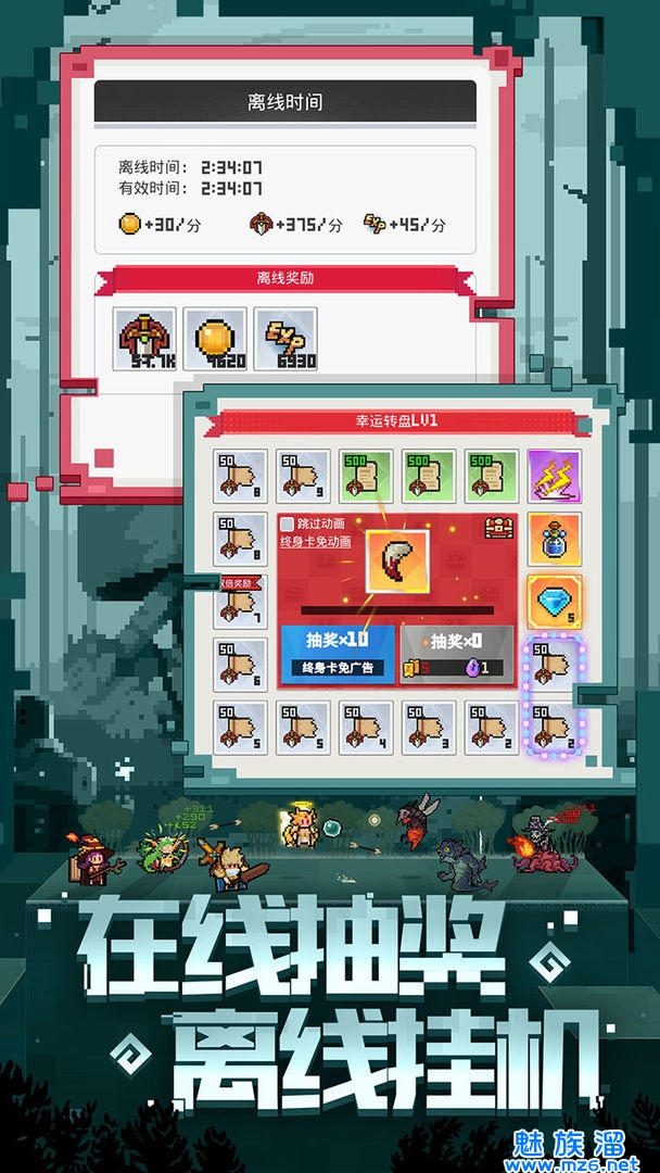 离线挂机后获得大量收益;上线:领奖培养、怪物合成、转盘抽奖三连
