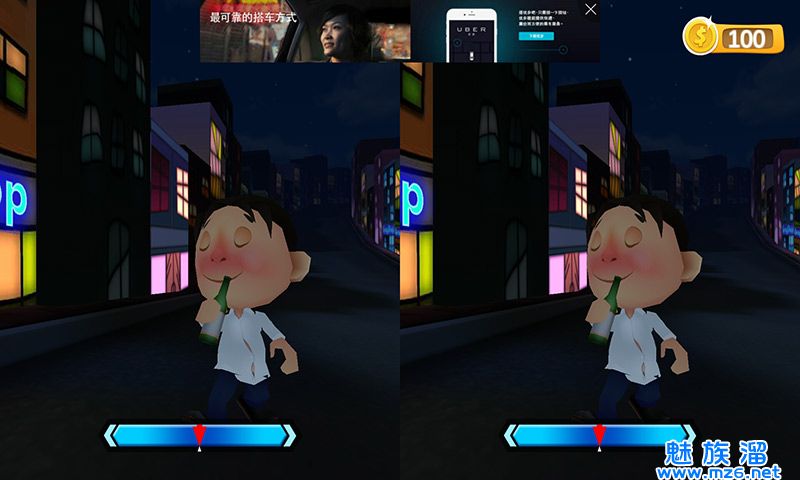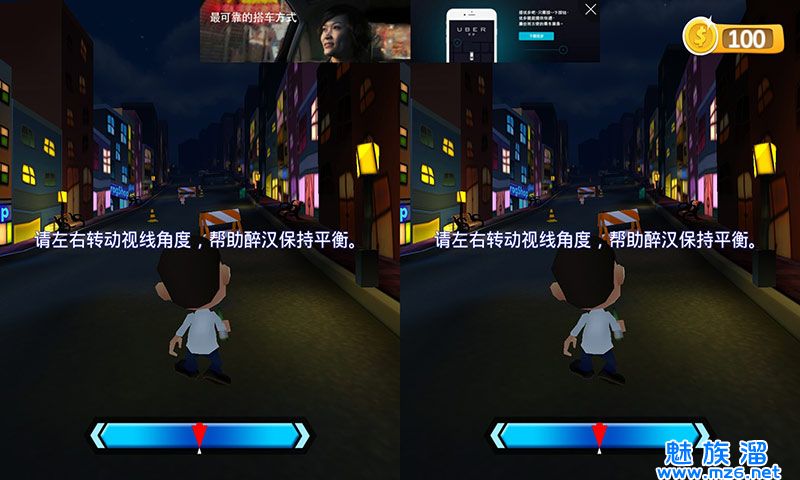 通过转动控制醉汉的方向,注意躲避障碍,初始有100金币每次摔倒扣除10点金币,当金币归零时游戏失败。