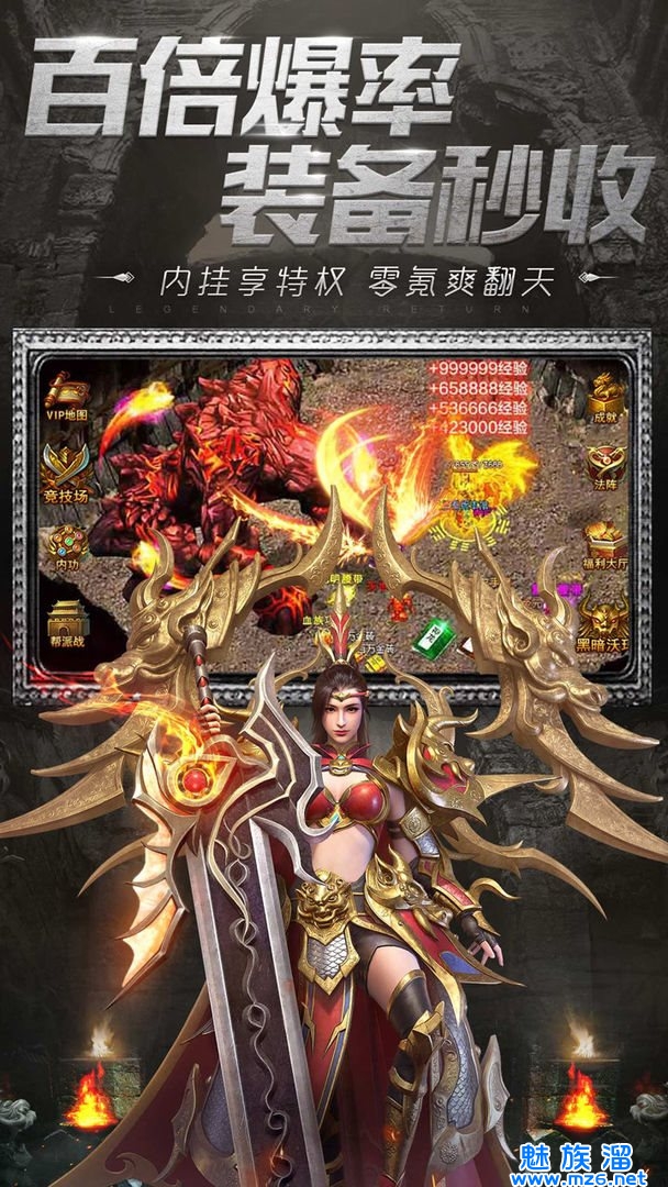 装备获取:分为普通装备、神器装备,游戏内上千件神器全部靠打,地图越高神器越好