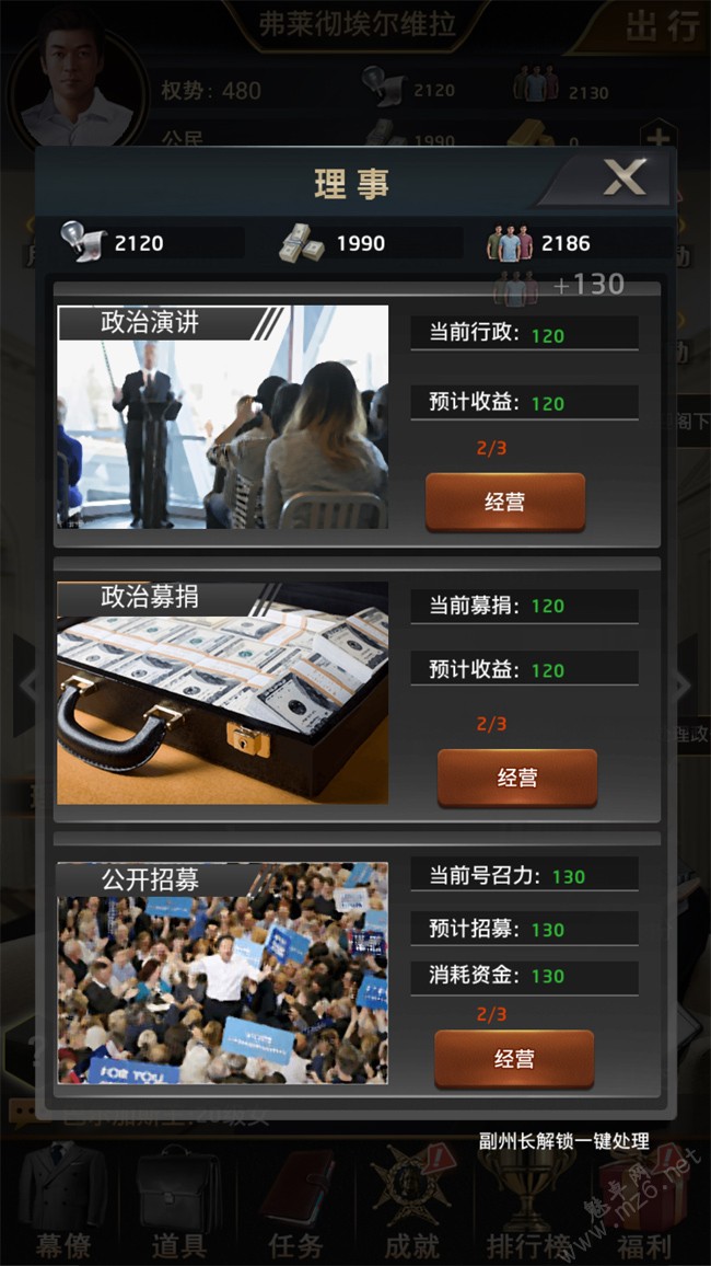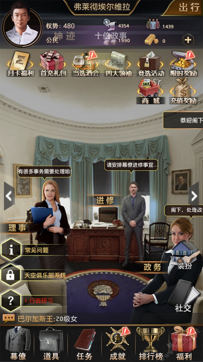 《权利的纷争》是一款现代风的经营养成类游戏,游戏画面精美,玩法丰富。在游戏里您可以招募属于自己的幕僚与情人,通过处理政务,征收资源提升自己的官职与权势。同时您可以在游戏世界中通过发展自己的党派不断壮大实力,协同党会盟友驰骋政坛,与来自其他党派的玩家竞争资源。如此刺激的政坛之争,你准备好建造属于自己的权利帝国了吗?