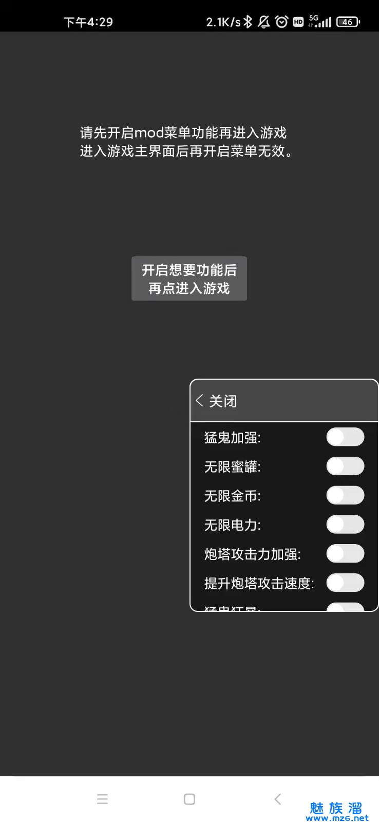 猛鬼加强,无限蜜罐、金币、电力,炮塔攻击力,提升炮塔攻击速度,猛鬼狂暴,加快猛鬼进场,维修无CD,免广告获得奖励。