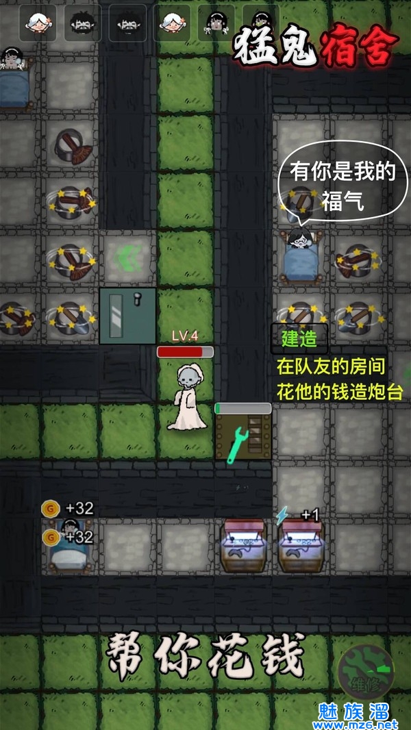 4、找到房间后点击上床,之后优先升级自己的门和建造炮台,在前期虽然炮台伤害不高,但是猛鬼的伤害和血量也是有限的;