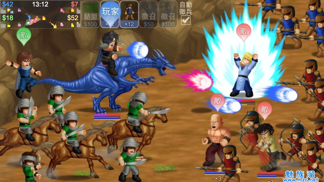 战争:在战场上赚钱招兵、攻城夺营,与百人大战。