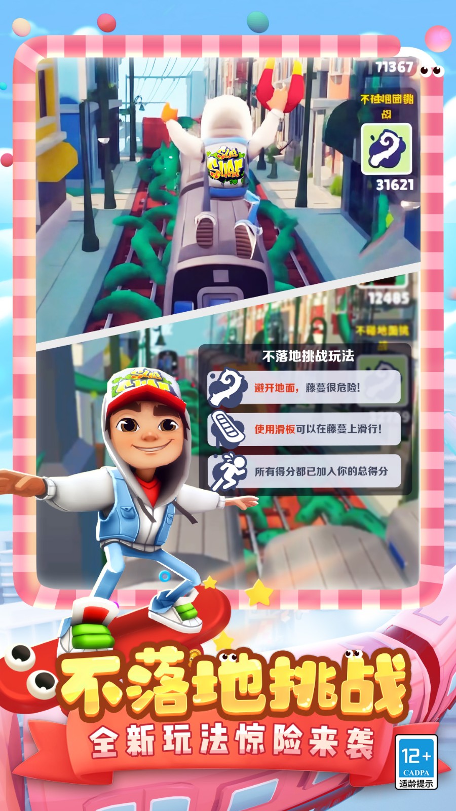 使用技巧 :开场就使用滑板是不可取的,太过浪费。通常,都会在分数超过一定分数后全程覆盖,有了就用,以冲击记录。自己稍微熟练一点,通常都是在30w分以后才会开启,在刚玩游戏的开始时,自己分数超过10w就会开始使用。因个人习惯而异。