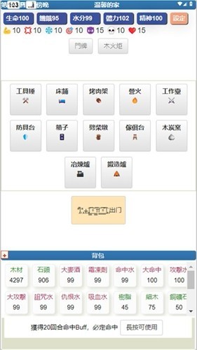 4、玩家在收集物资时要注意自己的体力,在体力不足的时候千万不能狩猎,否则会被打死,体力耗尽就需要回家补充。