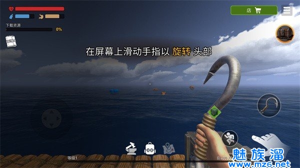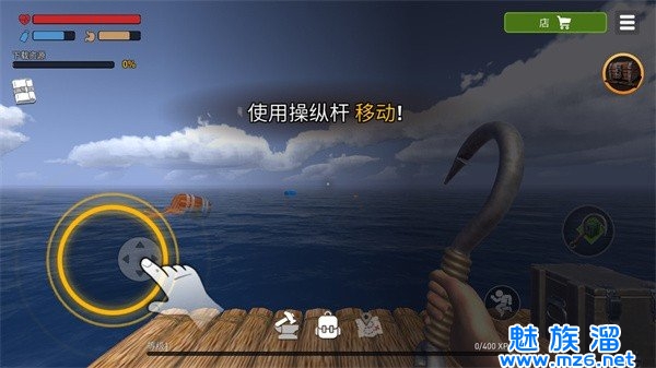 2、这里我们以生存模式为例,进入游戏,我们需要利用操纵杆控制人物角色在木筏和水中移动;