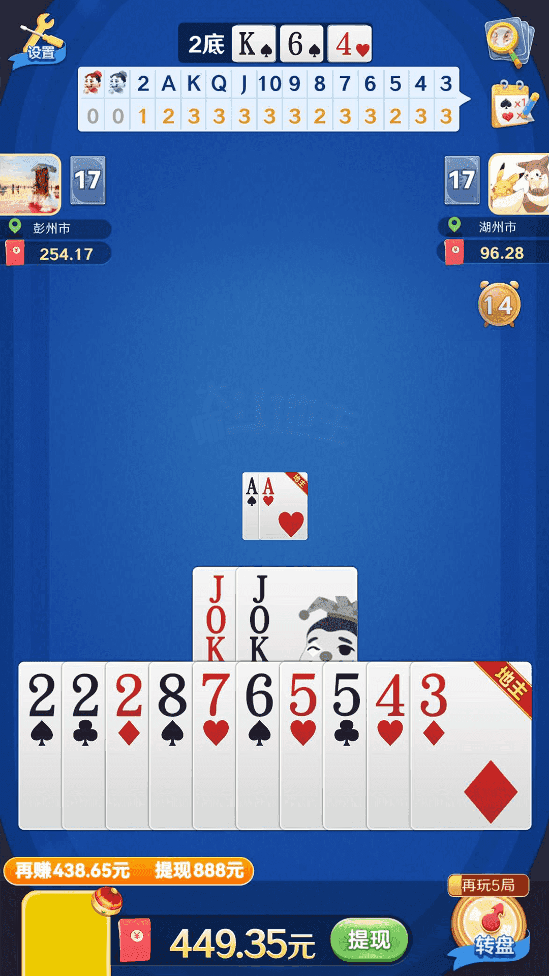 3)如果地主出" A",地主下家就可以出" 2"取得出牌权。
