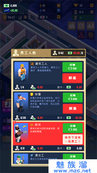 处刑室模拟器是一款非常好玩的模拟监狱游戏,在这里玩家身为典狱长,首先要花费金钱招募狱警,同时也要让犯人进行不断地训练,并防止囚犯逃跑哦。玩家还可以使用金钱来加固你的监狱,并容纳更多的犯人。喜爱模拟经营玩法的玩家不要错过,快来下载试一试吧。