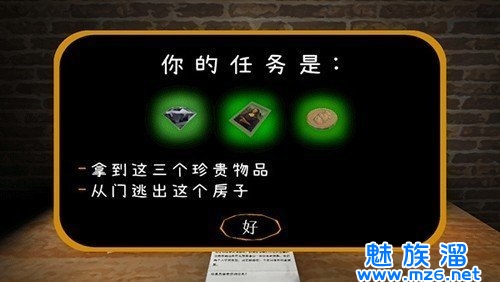 3、游戏玩法非常简单,你的任务就是拿到如图的三个珍贵物品,从门逃出这个房子即可完成任务。