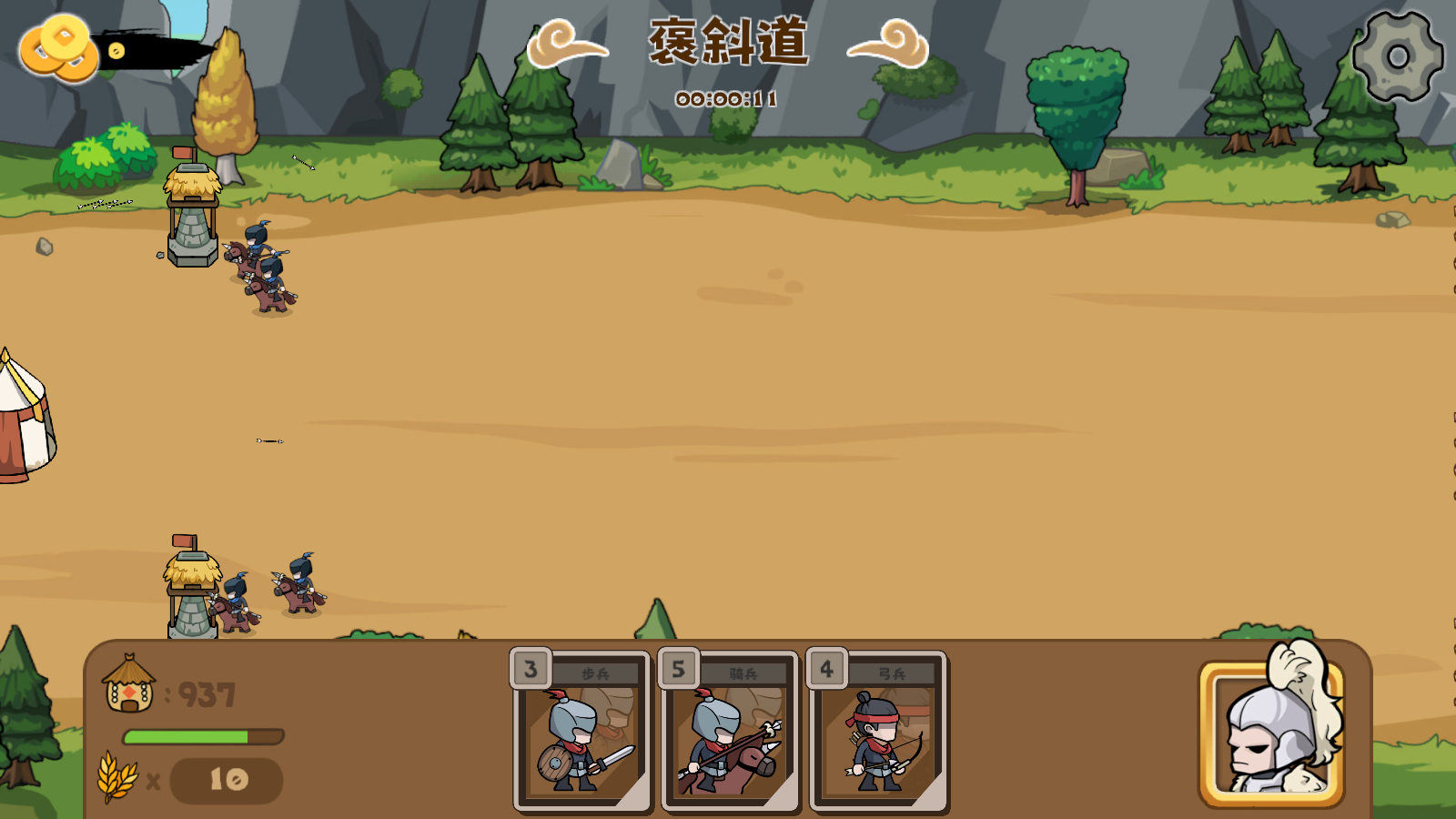 1、游戏分为骑兵、步兵、弓兵三个兵种,每一个兵种都有不同的优势,只要搭配的好,就能发挥其作用。