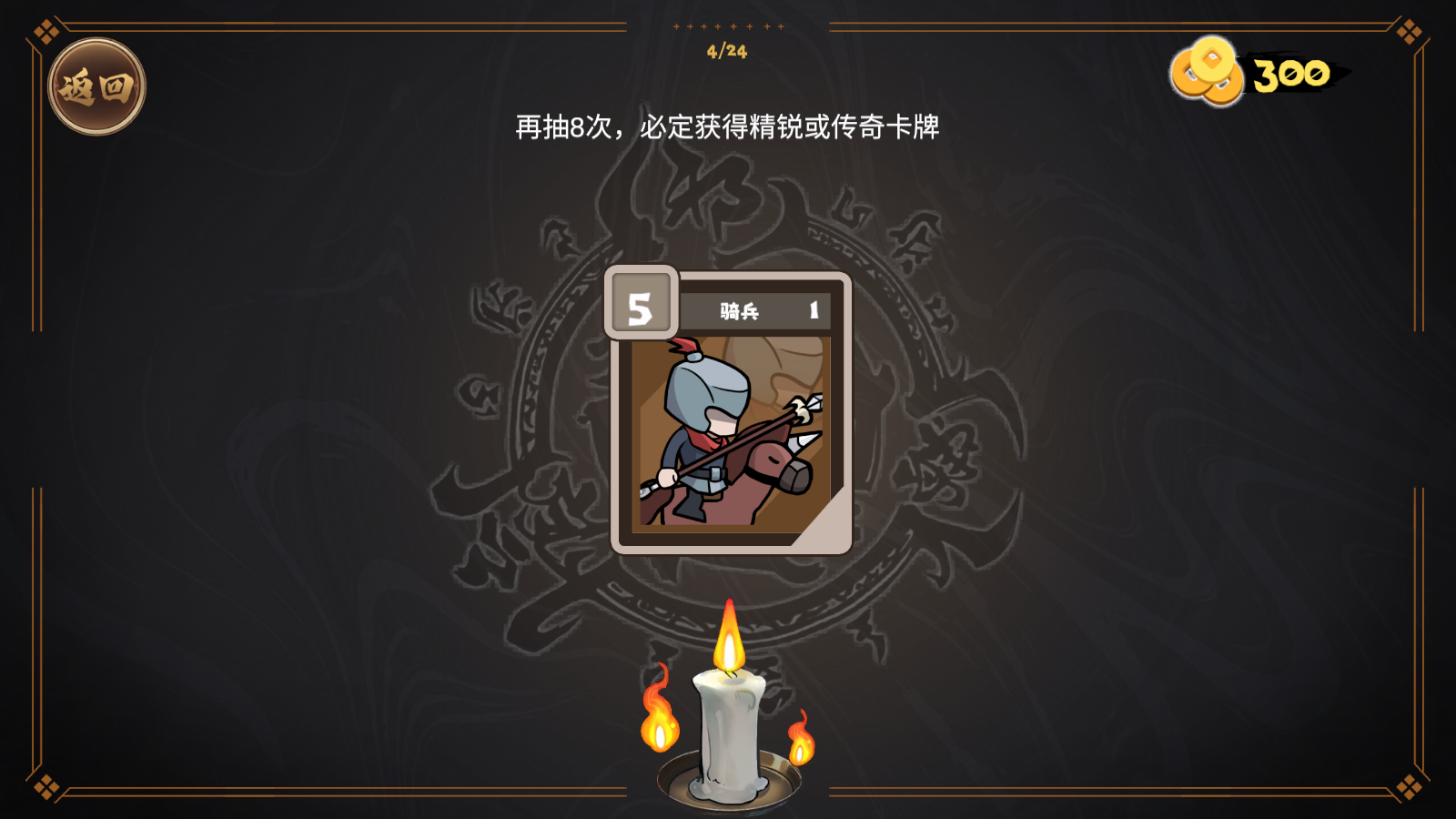 2、随时可以去抽卡获得武将,消耗100铜钱就能抽卡一下,并且只要抽卡10次,必定可以获得精锐或者传奇卡牌。