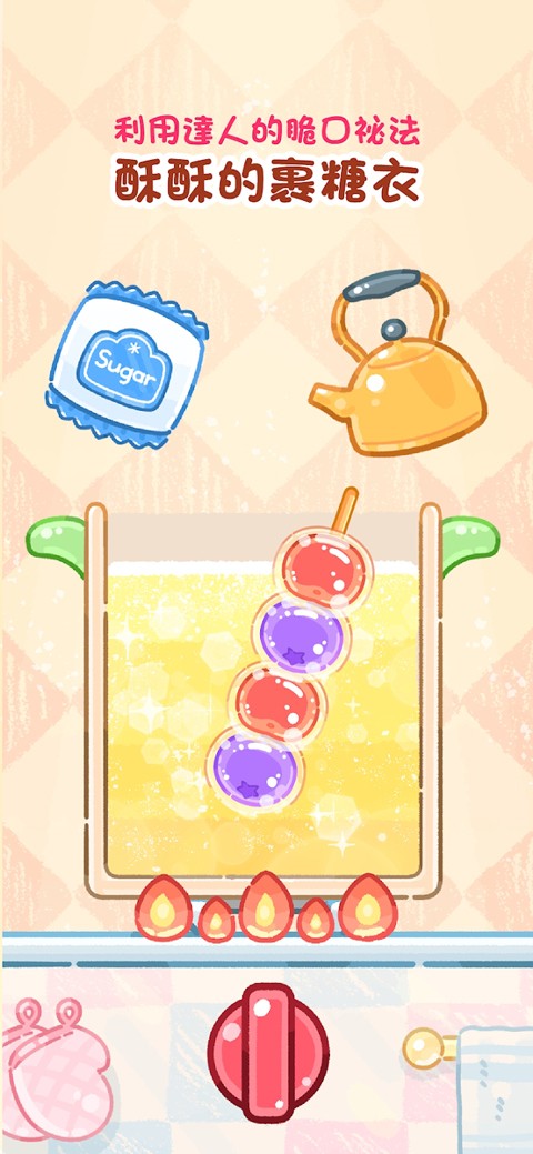 糖葫芦达人是一款卡通画风模拟游戏,游戏中玩家将扮演一位糖葫芦制作大师,通过收集和使用各种精美的食材,如新鲜的山楂、香甜的草莓、诱人的葡萄等,来制作出色彩缤纷、口味多样的糖葫芦。糖葫芦制作过程非常真实,玩家需要控制好糖浆的温度,过高或过低都会影响糖葫芦的制作。