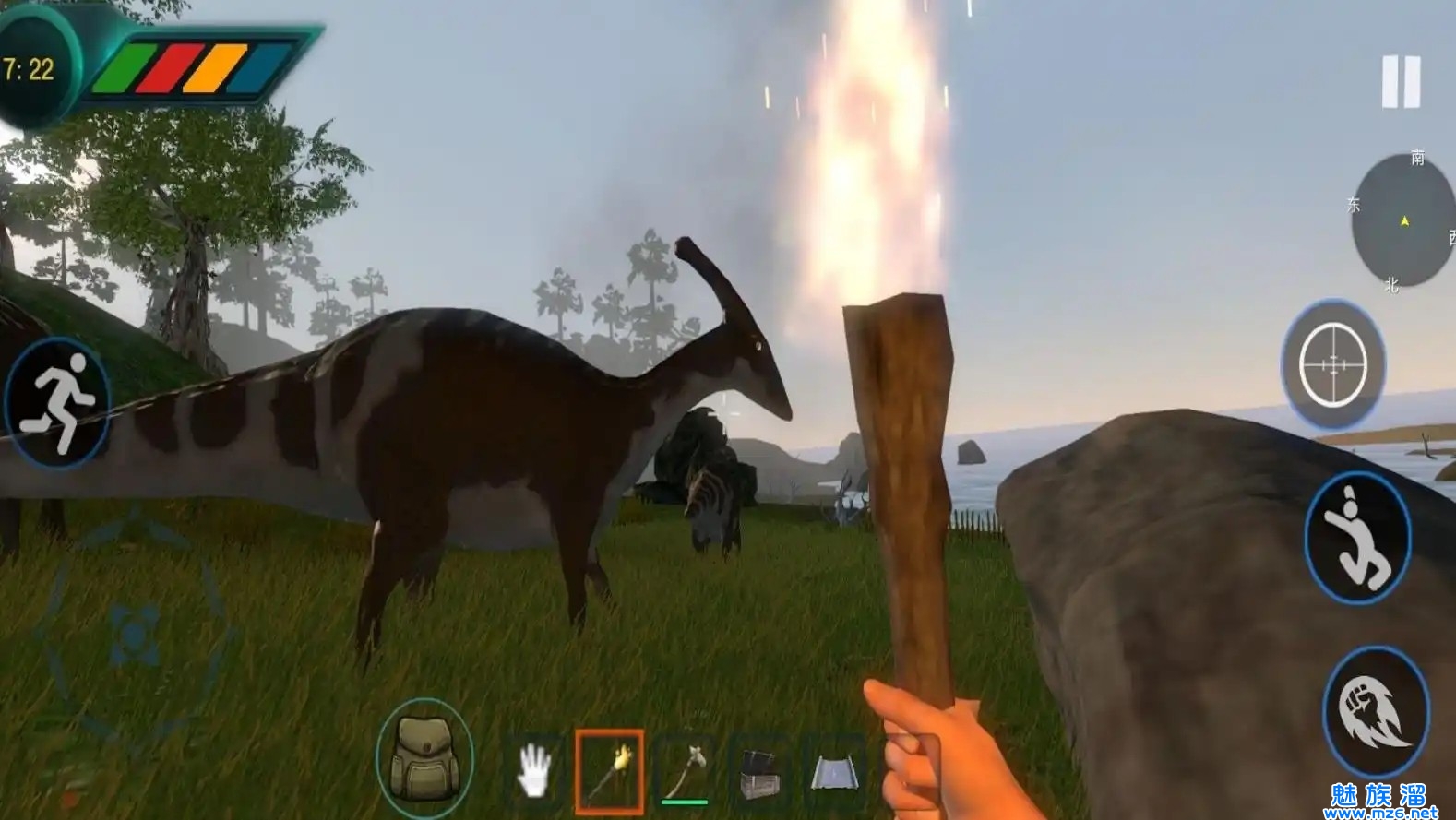 1. 玩家可以选择并使用不同的原始武器与恐龙进行战斗。