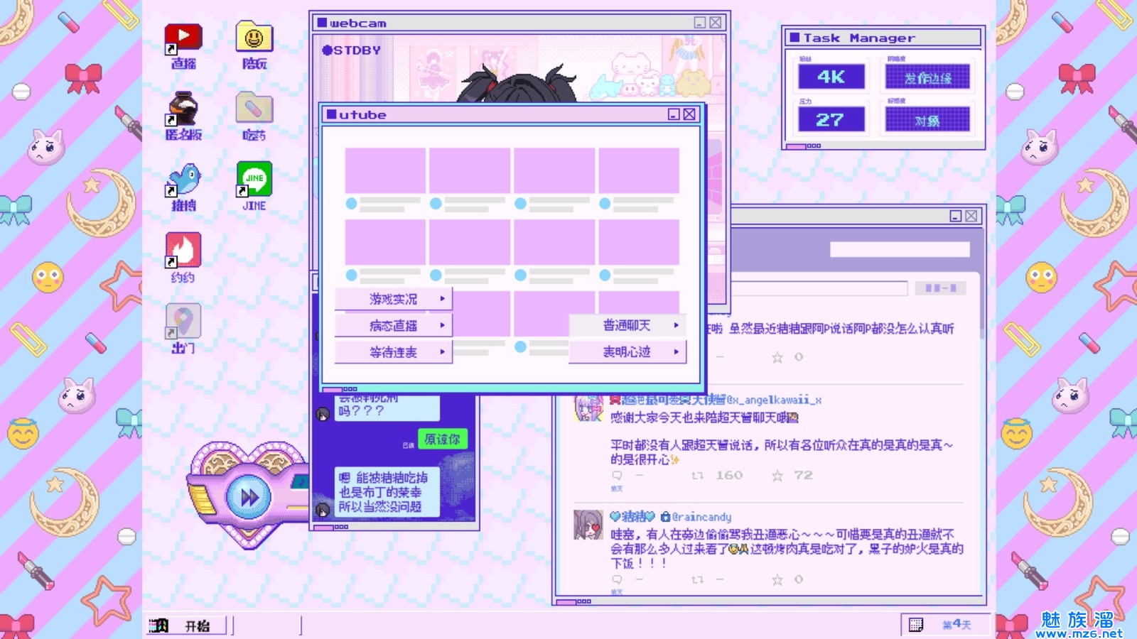 日常安排。游戏中的每一天,玩家需要合理安排主播的活动,如直播、交流、玩游戏等。不同的活动会影响到主播的压力值和粉丝数。