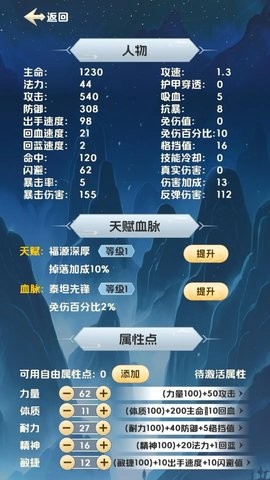 1、首先,建议将角色属性刷新至力量与敏捷均达到28以上,魔力属性无需过多关注,其余属性保持适中即可。其次,建议选择无上仙体与任意金色血脉作为初始状态。