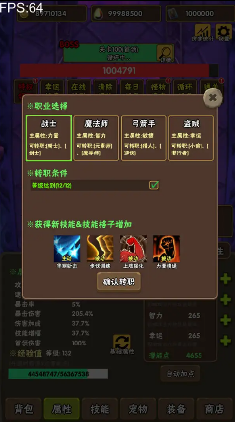 金币的使用:未满75级前,优先商城购买经验值。75级后如果属性不满足转职条件买潜能点。如果属性值满足了转取条件。优先强化装备,再买潜能点。
