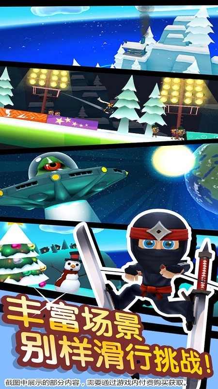 不仅可以挑战夺命竞速,还可以滑动屏幕作出特技动作!根据单、双板和坐骑的不同,特技动作也会发生改变!向前、向后、向上、向下赶紧试试吧!!!