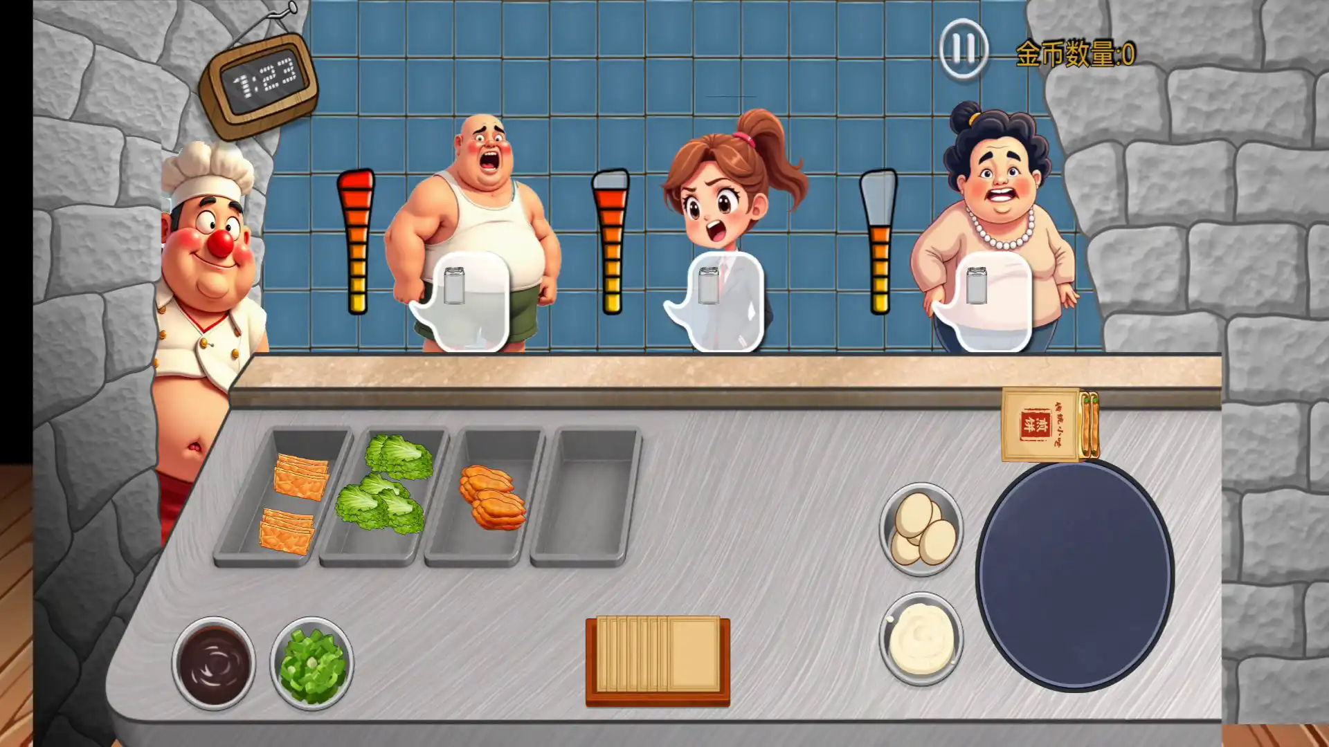 3、还能够通过顾客提出的要求来制作,添加需求的各种食材,使用金币能够扩大煎饼店。